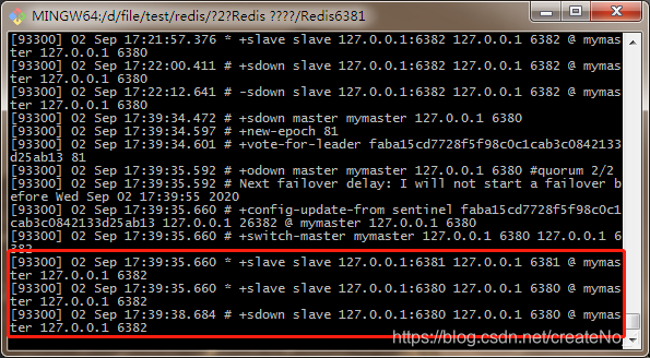 直接断掉 redis6380 的服务运行,观察从服务的 sentinel 服务的打印日志,Redis6381 的 sentinel 服务打印日志如下: