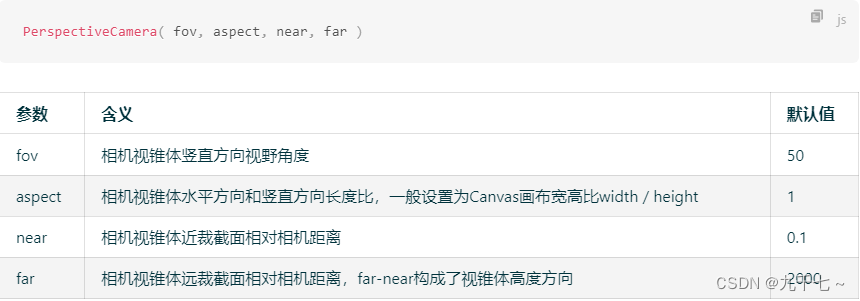 透视投影相机的四个参数fov, aspect, near, far构成一个四棱台3D空间,被称为视锥体,只有视锥体之内的物体,才会渲染出来,视锥体范围之外的物体不会显示在Canvas画布上。