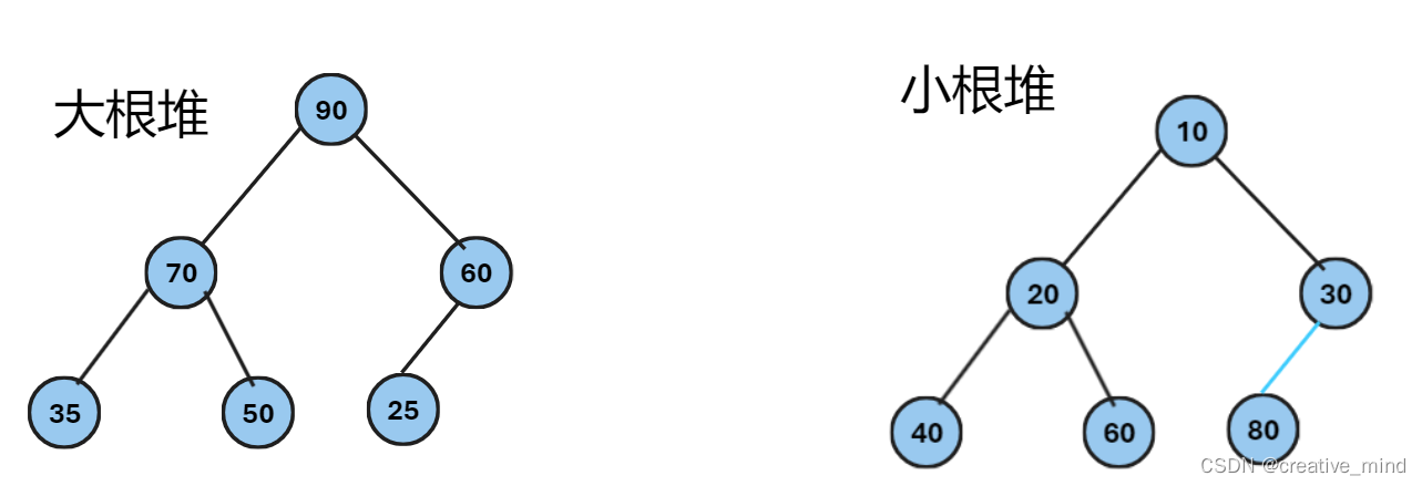 将根结点最大的堆叫做最大堆或大根堆,根结点最小的堆叫做最小堆或小根堆。画图如下: