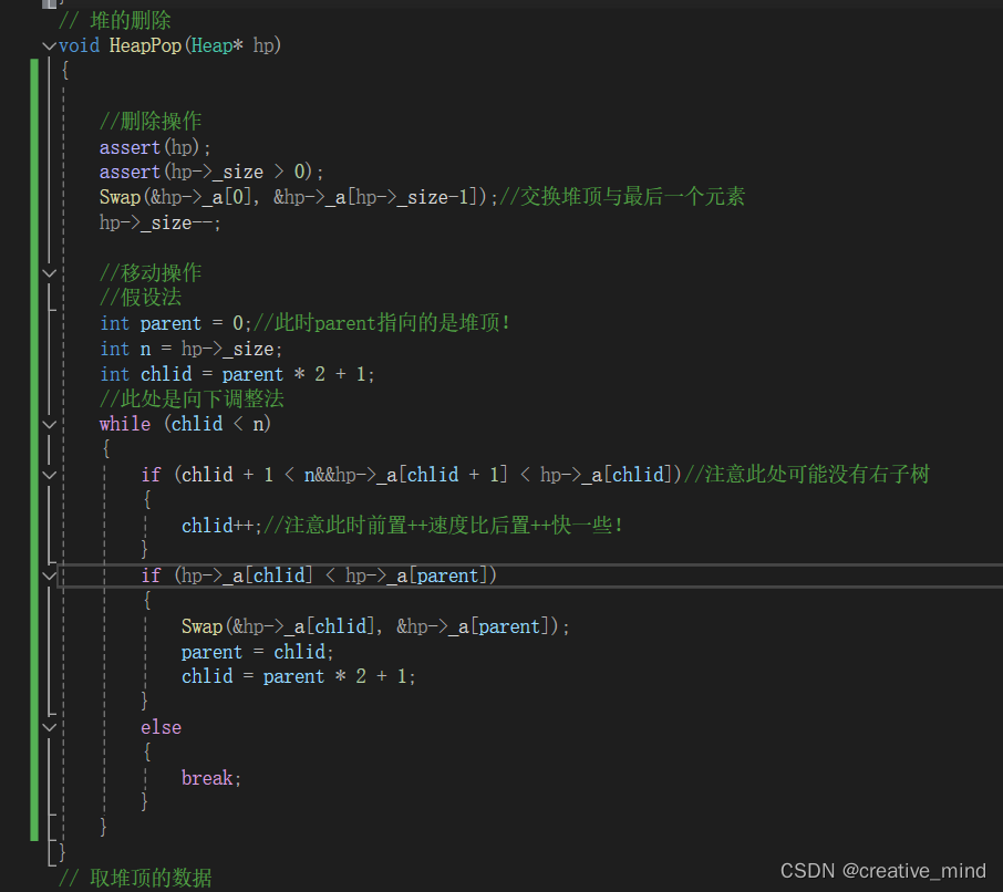我们接着往下:void HeapPop(Heap* hp);重点是向下调整!