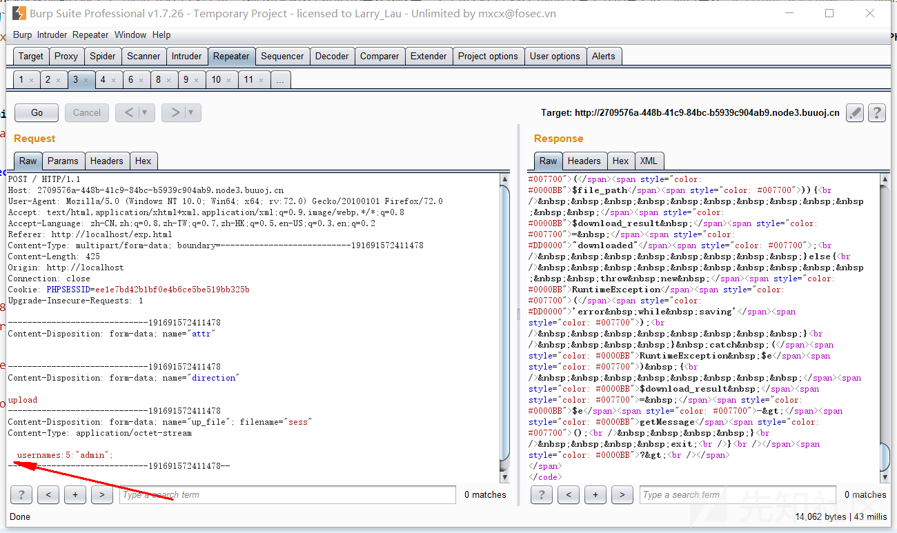 这里session内容的格式确实是太坑了,查看hex发现前面还藏了个0x08的不可见字符,我们如果想要构造时也需要修改第一个字符为不可见的0x08,有下载也有上传,而且需要session['username']===admin,因此我们应该需要构造并且上传一个session,并且知道其对应的PHPSSEID,再回到暗示性代码上: