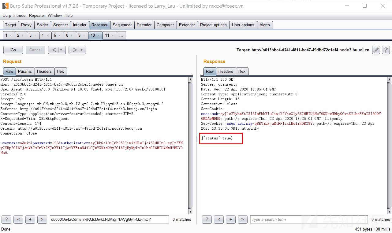 得到jwt token:eyJhbGciOiJub25lIiwidHlwIjoiSldUIn0.eyJzZWNyZXRpZCI6IjAuMiIsInVzZXJuYW1lIjoiYWRtaW4iLCJwYXNzd29yZCI6IjEyMyIsImlhdCI6MTU4NzU2MDY0Nn0.