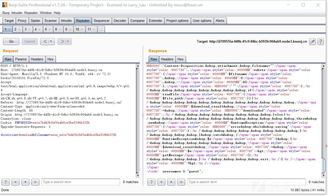 因为我们知道,session默认的存储名称为sess_XXXXX(为PHPSESSID的值),那么我们先结合download来看一下自己的session,因为服务器端存储的session内容以及格式我们并不知道,查看一下自己的PHPSESSID对应的session.
