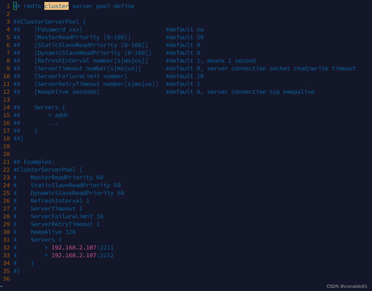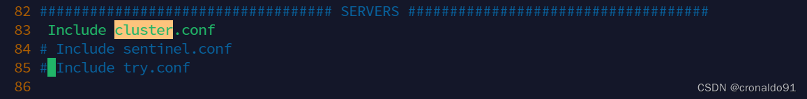 找到SERVERS模块,选用其中一种放开注释(Sentinel和Cluster只能选其一),放开sentinel的同时还要注释掉try