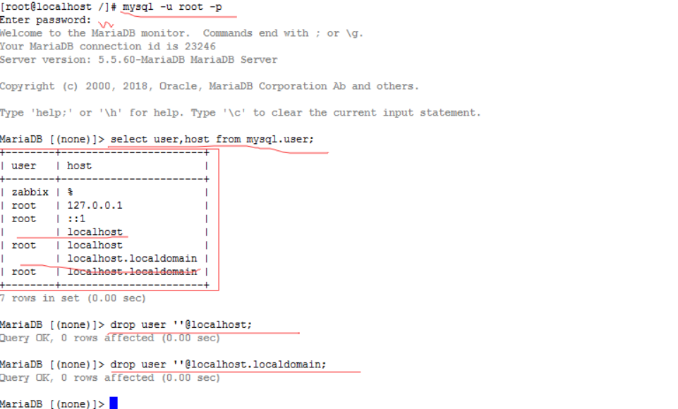 #select user,host from mysql.user; #有空用户名称占用导致本地无法登录远程可登录