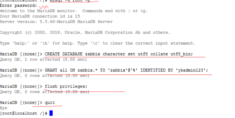 #GRANT all ON zabbix.* TO 'zabbix'@'%' IDENTIFIED BY 'ykadmin123'; #授予zabbix用户zabbix数据库的所有权限,密码ykadmin123