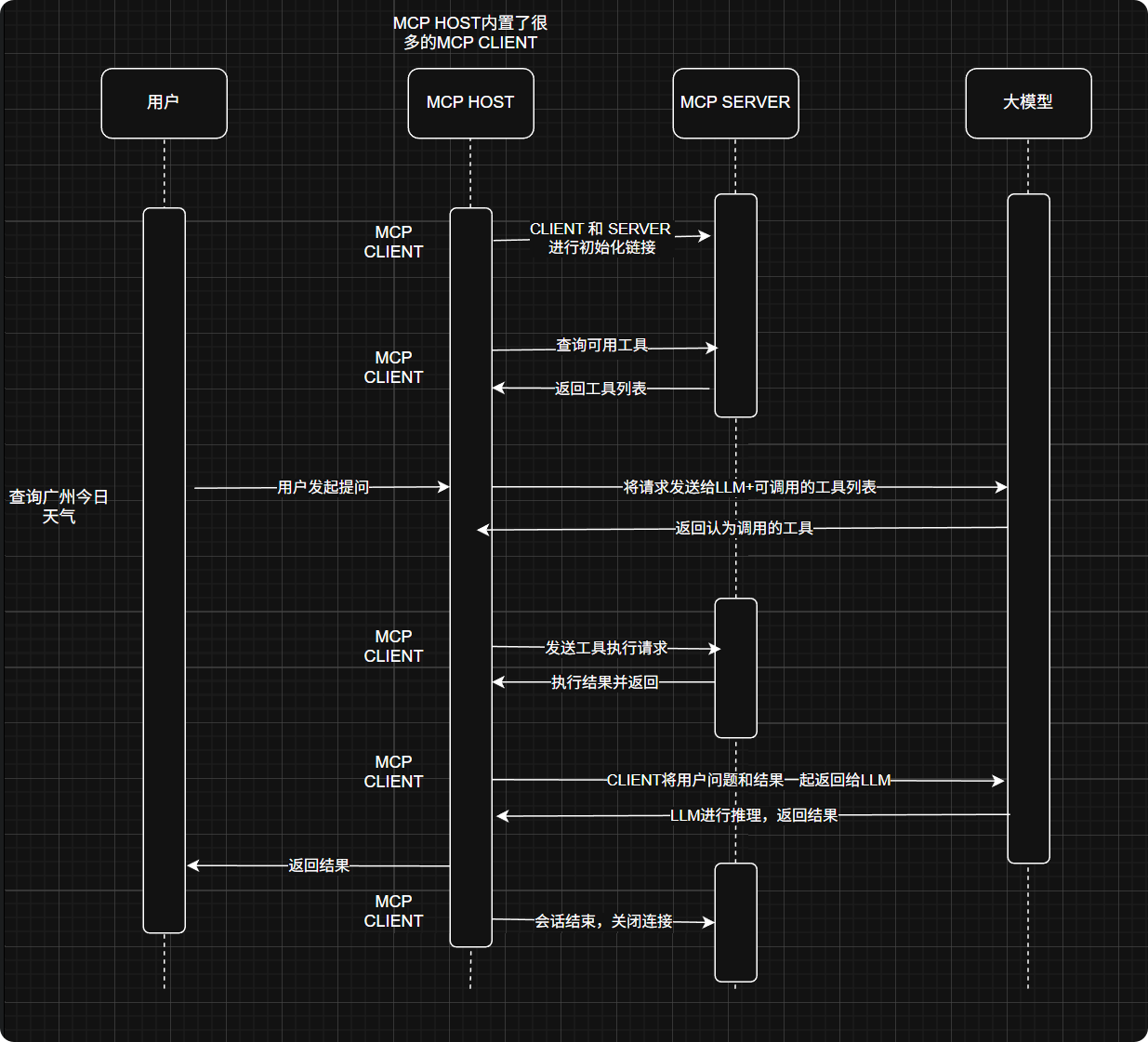| MCP CLIENT | 运行在 Host 内,与 Server 建立 1:1 连接,负责协议交互 |