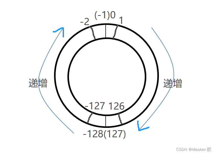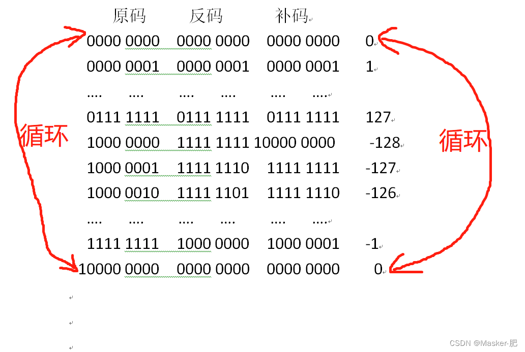 三、问题:为什么char类型值范围是-128—127?如果超出8位会是怎样呢?下面是推演的过程(9位数字在char类型中只有后8位是真实存在的,这里只是便于展示推导)。注意一定要自己推演一下过程!!!