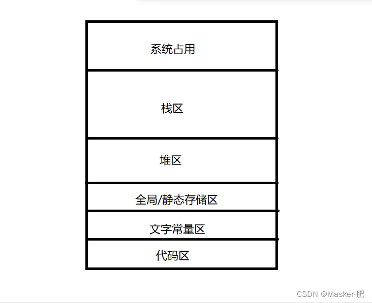 32位操作系统虚拟内存是4G,分为系统占用空间和局部变量占用空间(栈区),动态划分空间(堆区),全局变量/静态局部变量占用空间(全局/静态存储区),字符串/数字常量占用空间(文字常量区)和程序代码占用空间(代码区)。