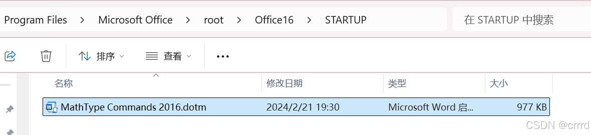 但是在把这两个文件复制到office的路径中我遇到了个小问题,虽然大部分帖子中给出的路径相同,但是每个人StartUp文件的位置不尽相同。我直接在电脑上搜索名为Startup的文件夹,然后选择Office安装路径中的,C:\Program Files\Microsoft Office\root\Office16,将MathType Commands 2016.dotm粘贴到STARTUP文件夹中。