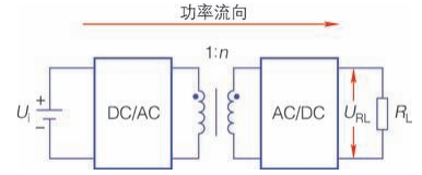 如下图所示,直 - 交 - 直变换器首先通过电力电子器件将直流电源 Ui 转变成交流电(一般称作逆变),然后通过变压器(升压比为 1:n)升压,最后通过整流、滤波电路产生变压后的直流电,以供负载使用。