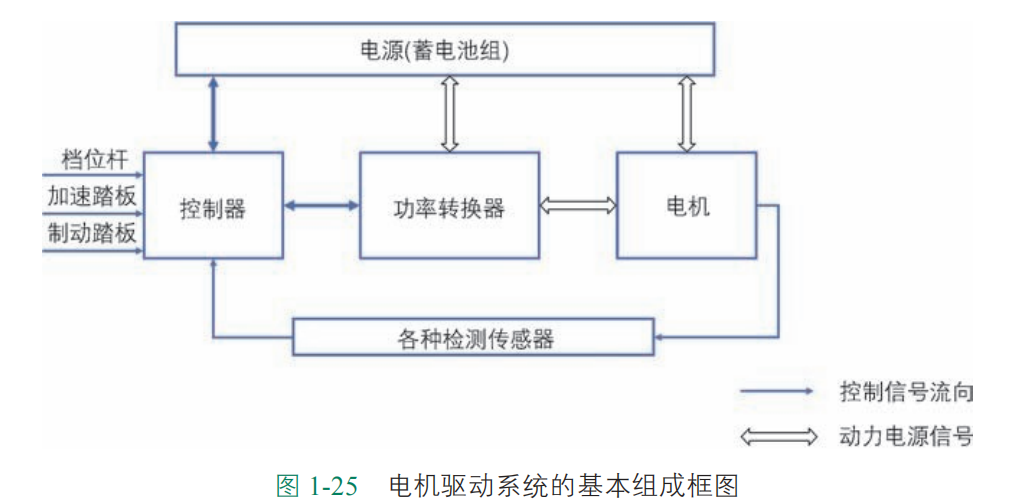 电驱动系统包括电机驱动系统与其机械传动机构两个部分,电机驱动系统主要由电机、功率转换器、控制器、各种检测传感器以及电源等部分构成,结构如图 1-25 所示。