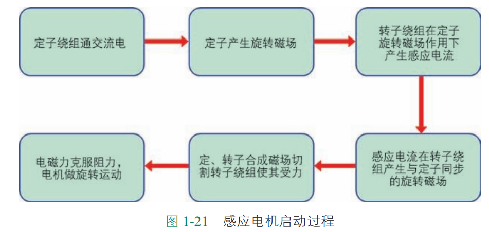 感应电机又称异步电机,即转子置于旋转磁场中,在旋转磁场的作用下,获得一个转动力矩,因而转子转动。旋转磁场的转速和转子的转速不一致,通常有 2% ~ 5% 的速度差(转差,slip),因此称为异步电机。大多数设计中,转子是可转动的封闭导体,即电路上是短路状态,通常呈松鼠笼形状,也有人形象称为“鼠笼电机”。定子是电机中不转动的部分,主要任务是产生一个旋转磁场,其基本原理如图 1-21 所示。