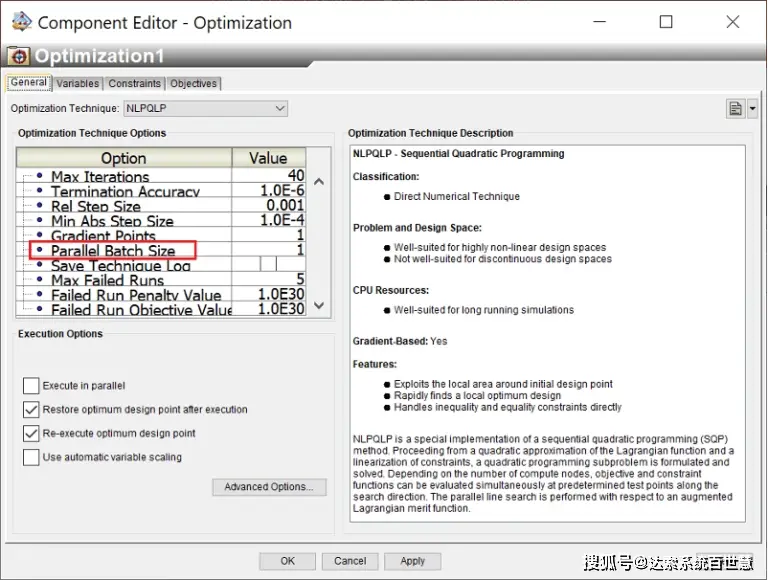在现有NLPQLP技术的基础上,增加了一个 “并行批处理大小”的新技术选项,该选项允许NLPQLP技术更好的利用可用的并行计算资源。