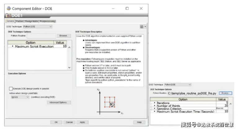 Python DOE技术允许用户在Isight之外使用Python定义自己的DOE算法,并且仍然可以使用Isight的集成和自动化功能。设计矩阵可以由用户提供的算法生成,并由Isight执行DOE研究(自动评估所有设计点)并分析结果。