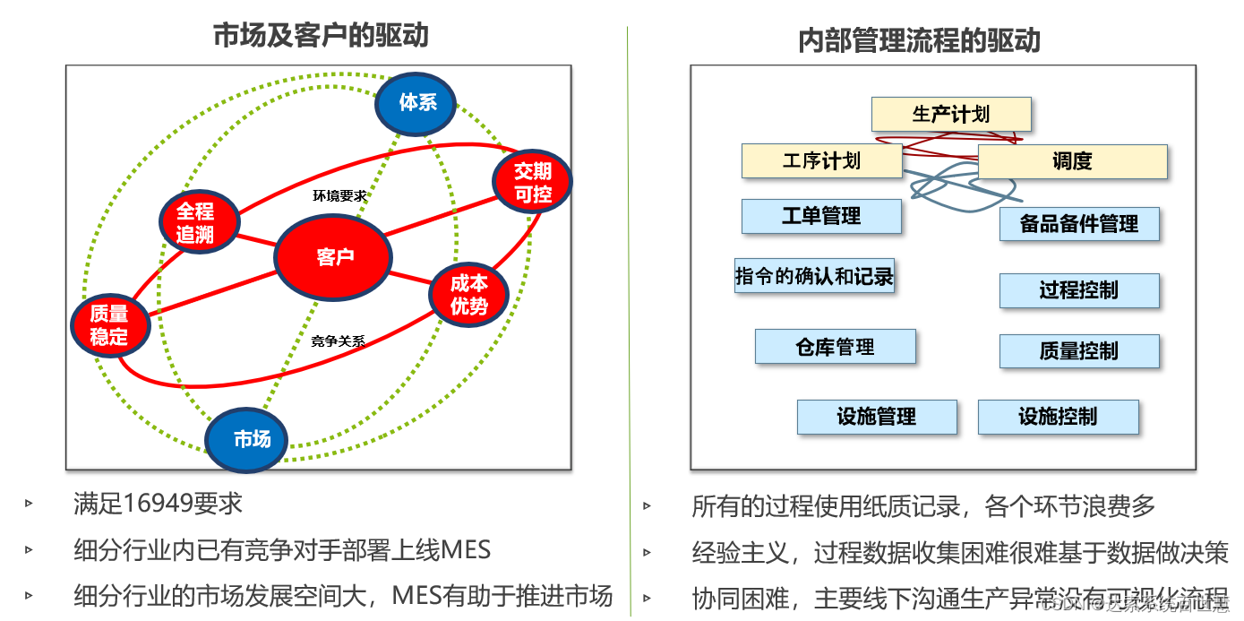 MES系统是将企业的管理理念从线下转到线上,通过实时监控、数据分析、资源优化和质量管理等功能,帮助企业提升生产效率、减少生产成本、快速响应市场需求、加强供应链协同、提高产品质量、改进管理决策等,从而帮助企业提高内部的管理和在行业内的竞争力,更好地应对市场变化和挑战。