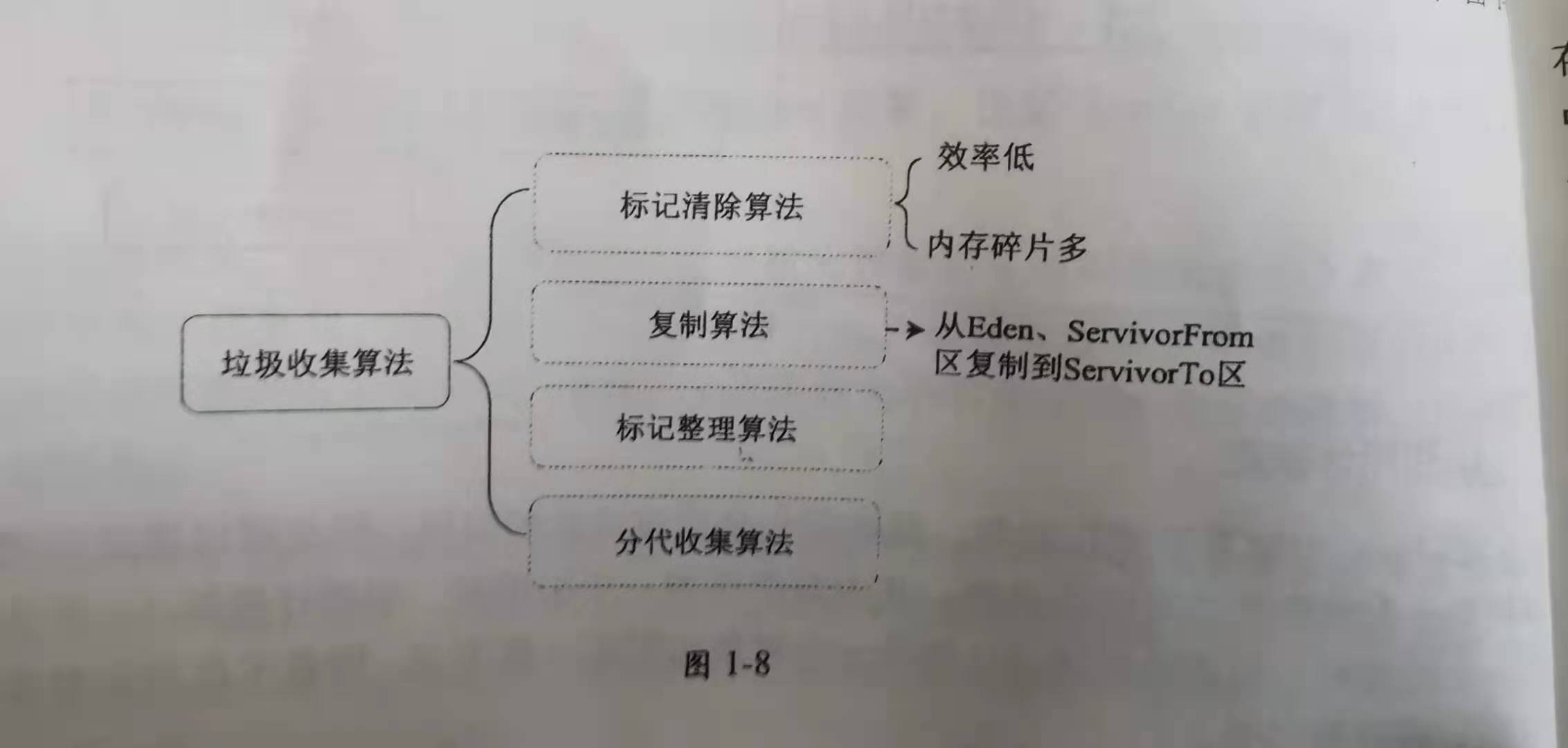(1)标记-清除算法:将垃圾对象先标记出来,然后清除。 缺点:会产生内存碎片,效率低(标记和清除两个阶段效率都低)