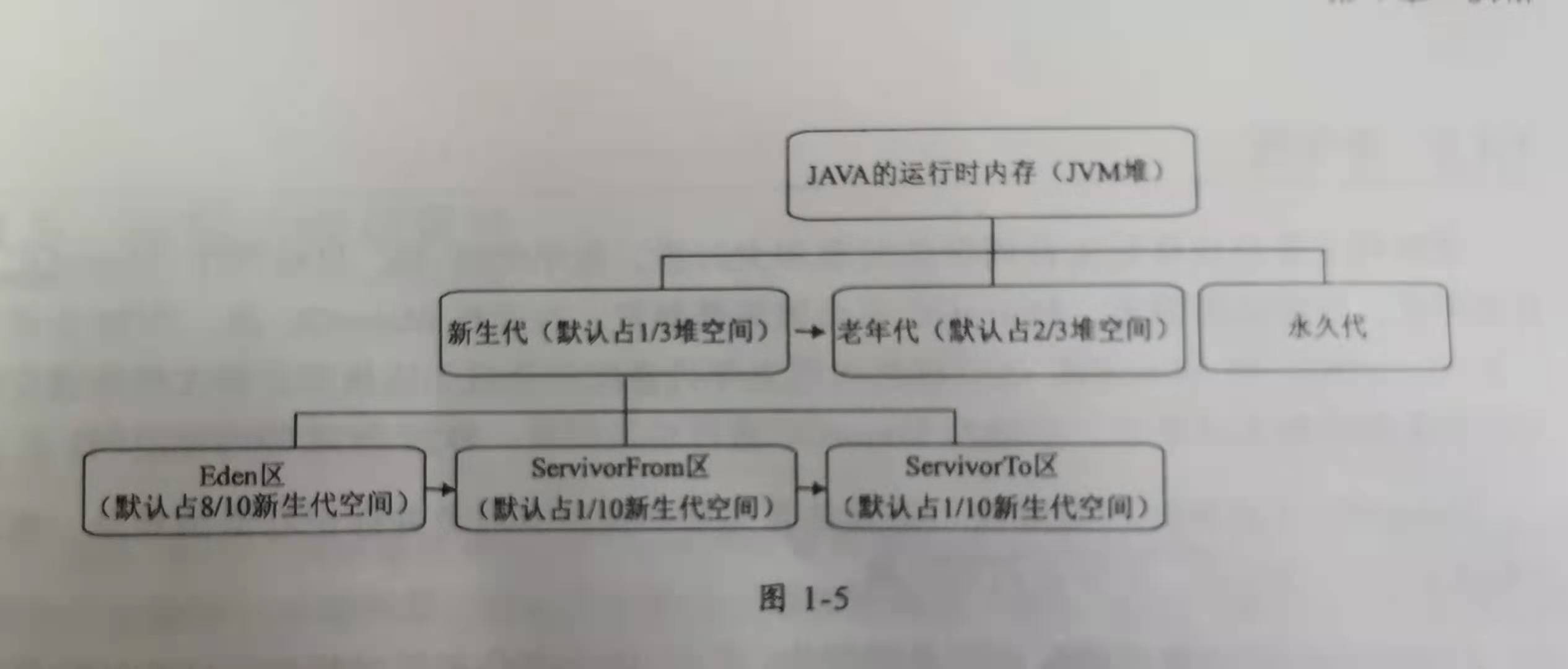 (1)新生代:存放短生命周期对象和小对象。新生代的GC过程叫作MinorGC,采用复制算法实现