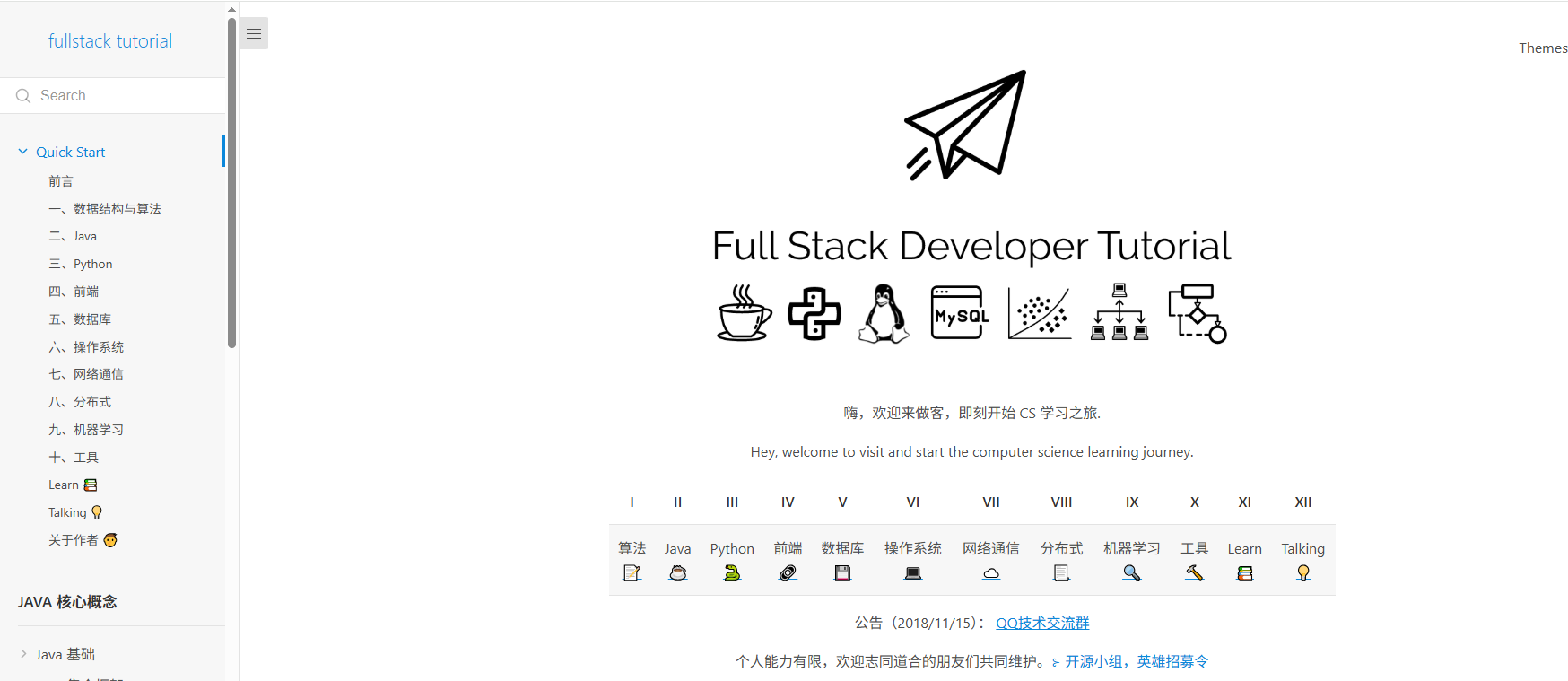 Java核心、J2EE框架、ORM框架、前端框架、安全框架、API网关、消息队列、作业调度、注册中心、配置中心、链路追踪、服务保障、搜索引擎、容器服务、开发工具、监控工具、设计模式、架构设计、工作流框架、服务器框架、大数据框架、分布式事务、缓存-数据库、数据库连接池、数据库中间件、XML语言教程、等技术栈
