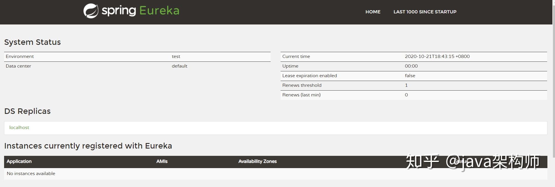 5.启动项目,然后访问http://localhost:8761/,可以看到 Eureka 的管理页面,表示 Eureka 启动成功了。