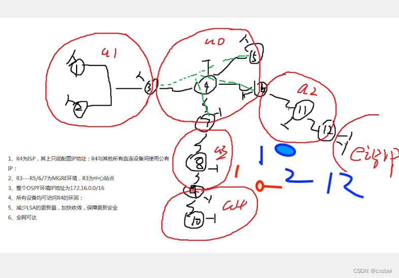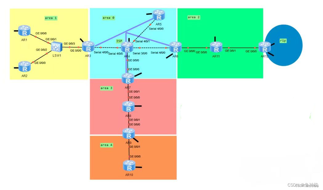 其中R12的两个换回启用RIP;area 4启用OSPF 进程4 ;area 4 是远离骨干的非骨干区域,R9上重发布将area 4 OSPF 2重发布到area 3 OSPF 1