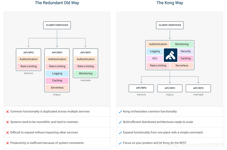 传统服务如下左图,通用函数重复使用在多个服务中,系统庞大僵化难以管理,由于会冲击其他服务导致的扩展困难,由于系统限制导致生产率低,如下右图是kong的解决方案