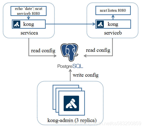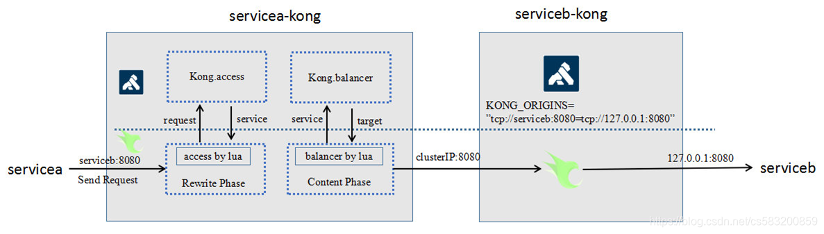 servicea -> servicea-kong -> serviceb-kong -> serviceb