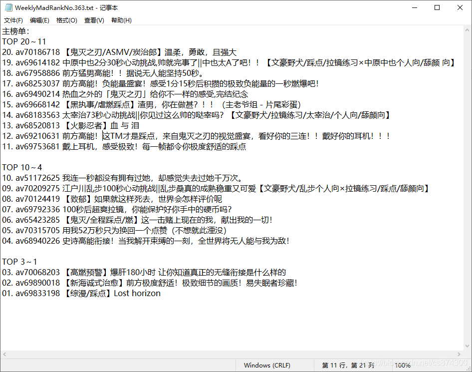 身为一个MAD爱好者会经常在B站上看MAD周刊,MAD周刊将近一周的MAD依据热度做成一个排行,我会把前20的av号标题以评论的形式放在下面。前两天觉得可以自己做个自动化脚本,只要输入MAD周刊的av号就能直接给出评论的内容,通过对视频图片进行OCR识别,获得上榜的av号,然后再得到其标题,最后以txt的形式保存。