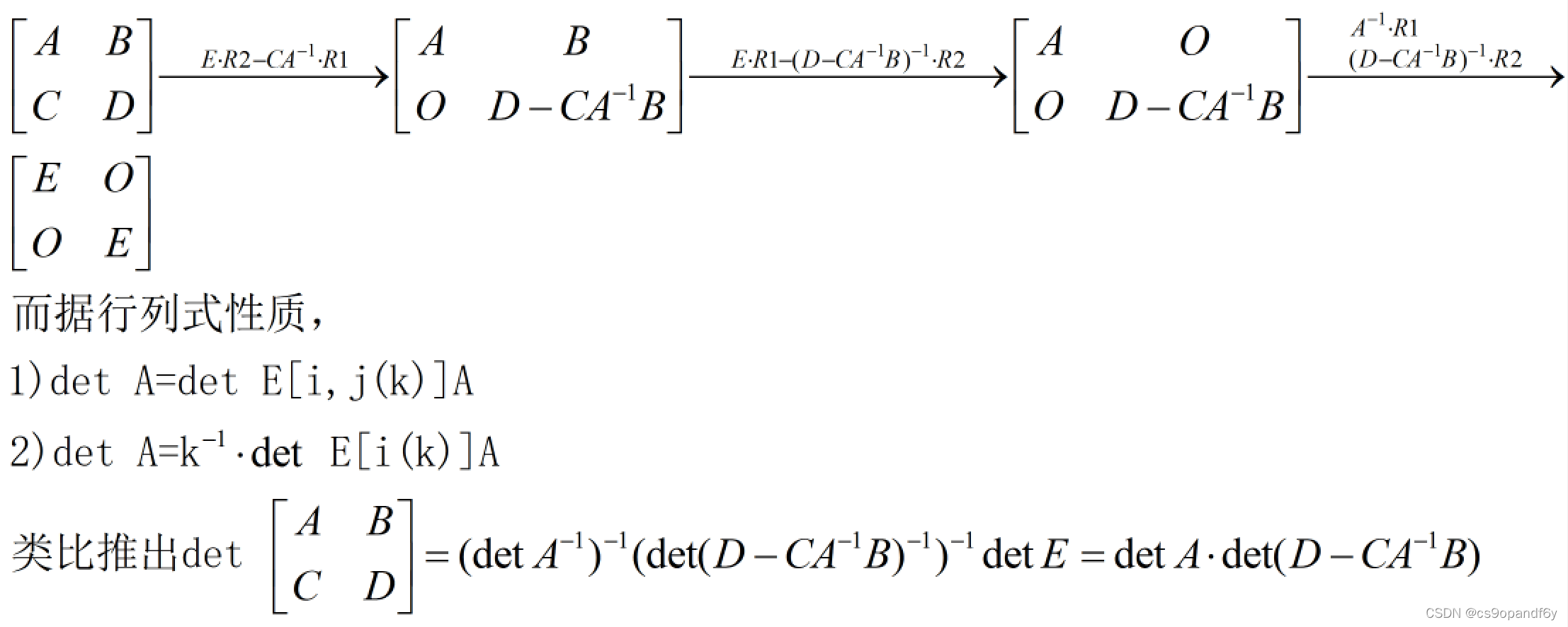 注2:当且仅当A可逆时,四分块矩阵可以这样分解;当B/C/D可逆时,可以同样分解(只要在变换中消去不同元素即可)。