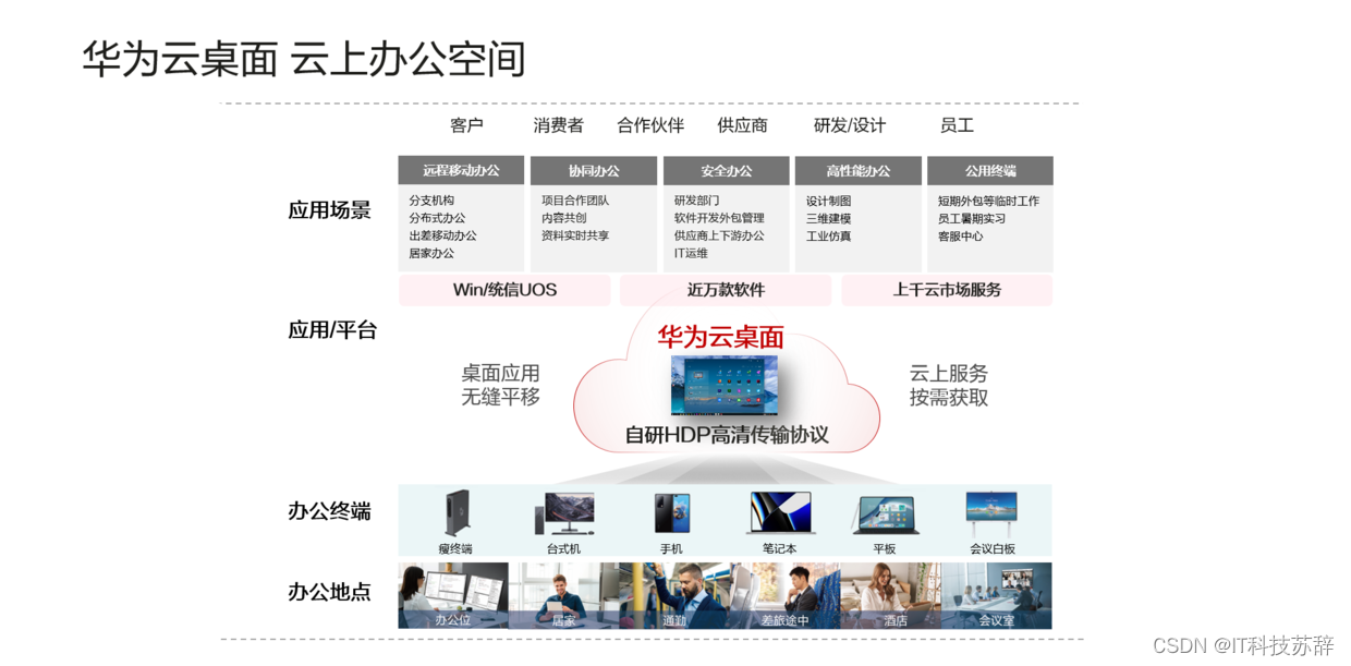 在办公模式方面,华为云桌面Workspace可以让用户不受办公地点及设备的限制,可以在任何时间、任何地点一键登陆云桌面进入云上办公空间,也可以在电脑端、PC端、平板电脑端和手机端轻松切换使用。工作场景下,用户可通过华为云桌面Workspace开展各种便捷化的操作,如在线会议、企业内部管理、组织机构设置、文档共享等等。