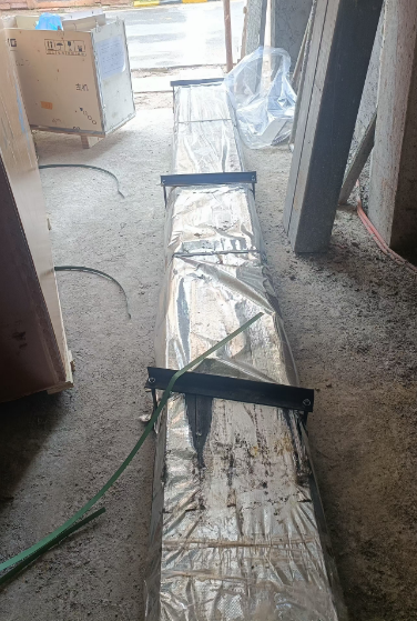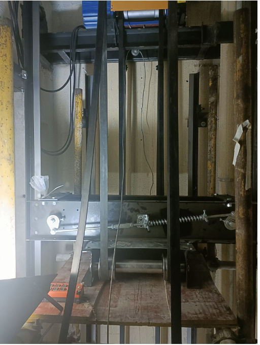 然后我先安装了轿厢的顶梁,因为我井道里有钢架,此时的对重已经在底部了,所以应该先把轿厢在顶部安装。