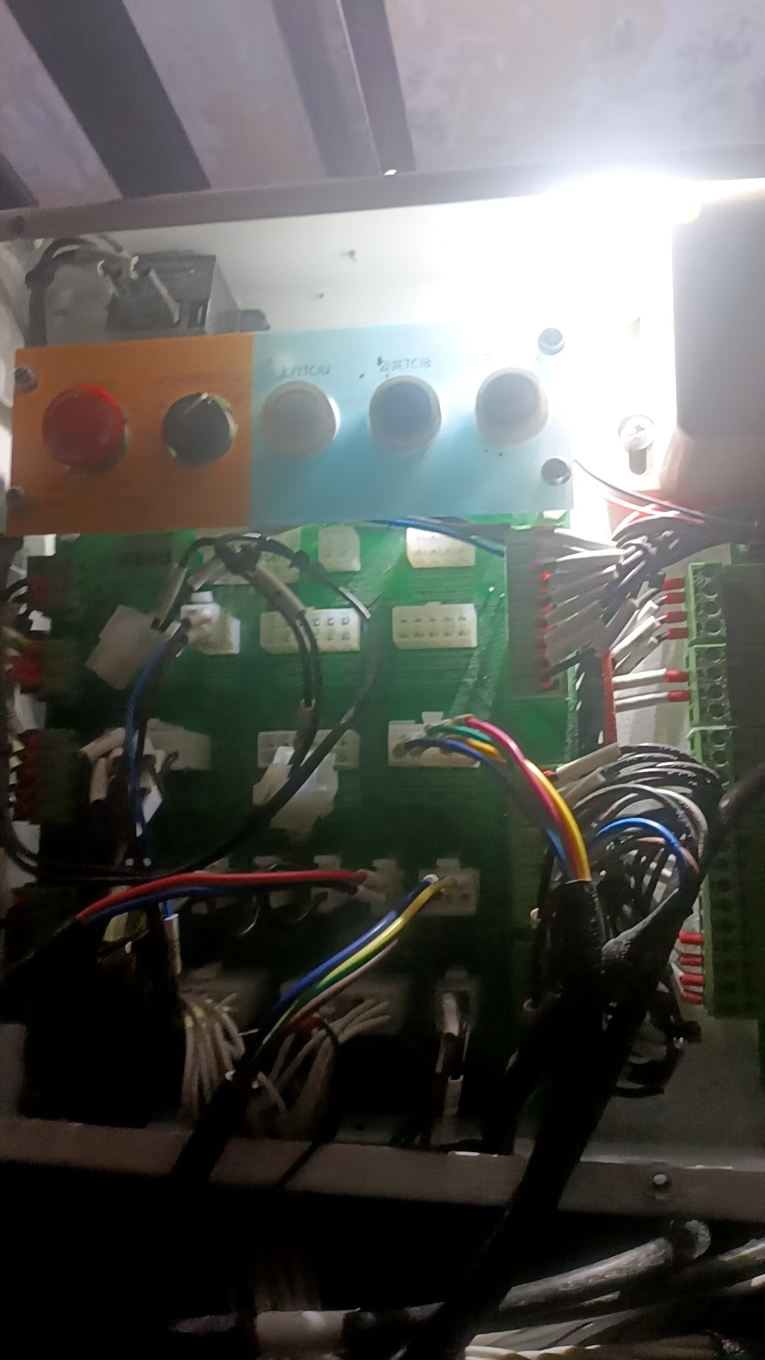 那个白色的电箱是轿顶箱,用来轿顶上面维修人员控制轿厢上下的,我先用来手动控制电梯了。由于很多传感器还没有安装,所以很多安全回路是短接的,相当于调试模式,否则电梯是不会动的。