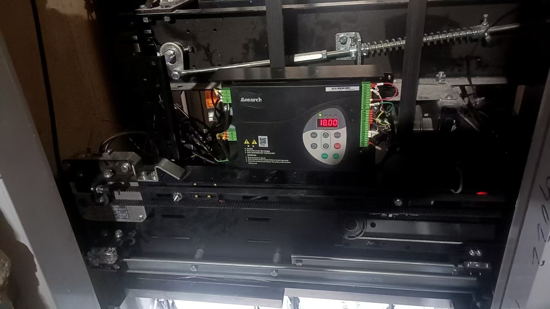 最后安装变频器,这个是默纳克的专用的的门机变频器,看了下各个参数,出厂时人家都给调试好了,我这个是旁开门,关门后需要打开门刀,并保持张力,所以这个变频器在关门后需要维持张力电流,我摸着是挺热的,目前我也没有想到什么优化方案,不知道能坚持多久,而且感觉会挺耗电的。