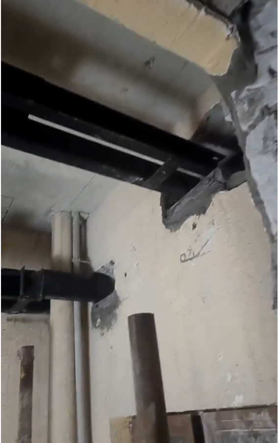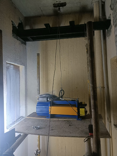 由于上叠有住户,这个电梯是无机房的,所以电机的空间非常小,顶部空间几乎紧贴者楼板。由于不了解楼板的承重,决定使用两侧的底梁承重并增加2条方管,从顶部一直到地面。不管怎样先搭钢架吧。