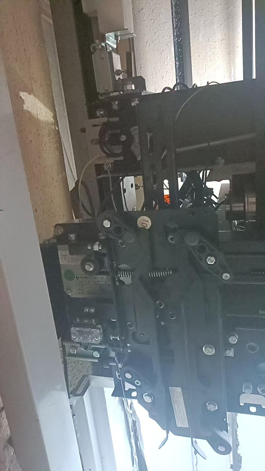 看得出来这个是轿顶吗,这一大坨是轿顶的横梁下面是导轮,很重,看起来挺能承重的。横梁侧面的一条斜拉的连杆结构就是安全钳,他和限速器联动工作,当轿厢下坠速度超过指定值(这台0.4m/s)时,限速器就会卡住,这个安全钳就会提起来,下面的钳口就会夹住轨道防止轿厢继续下坠,原理挺简单的,纯物理。