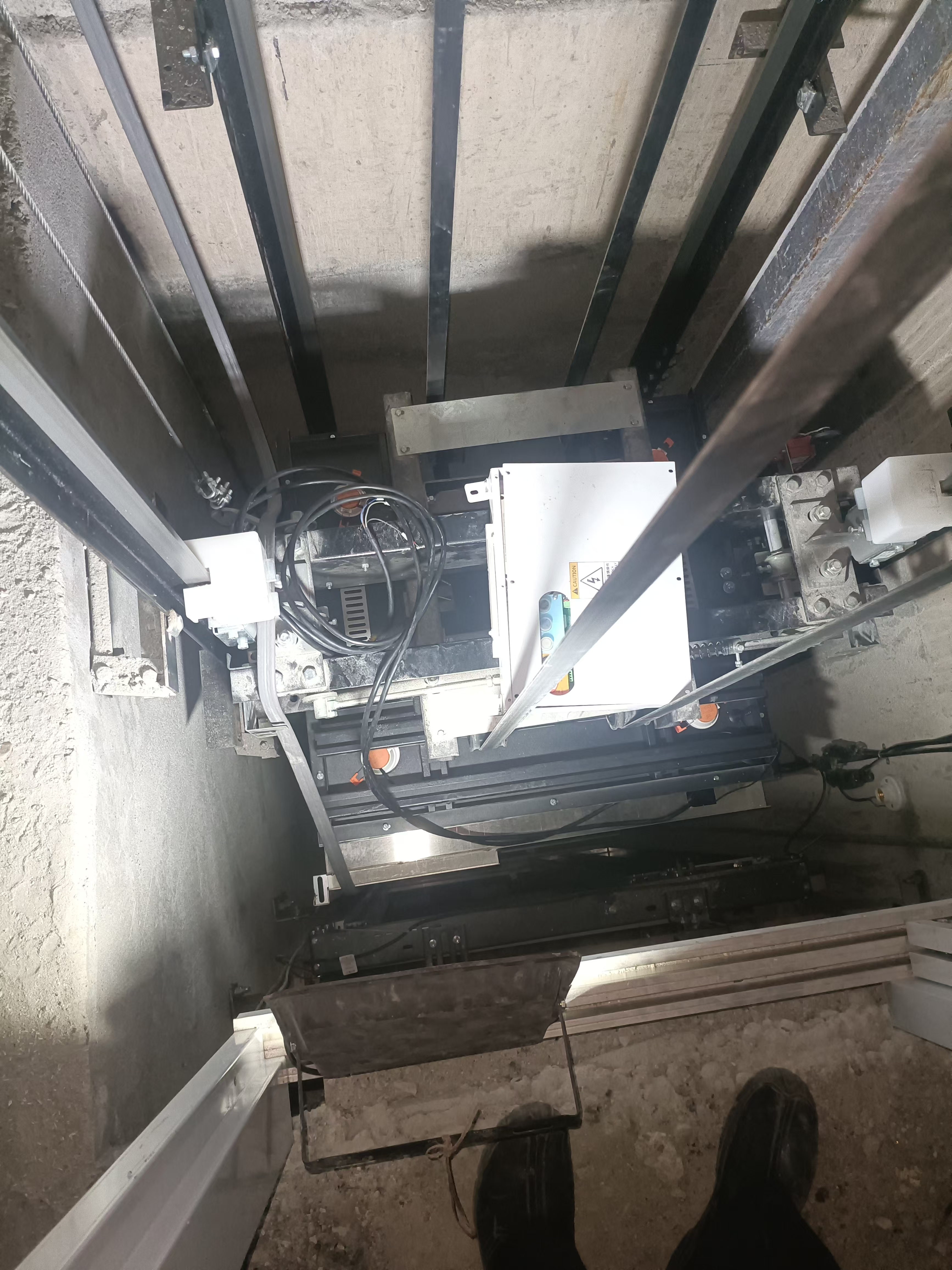 然后装上随行电缆,测试一下,把电柜的一些端子短接,让电机可以动起来。测试好后,可以拆除钢架了。让电机把轿顶部件放到底部合适的高度,把对重在顶部固定住,防止掉下来,很危险。然后就是开始安装轿厢。这个过程也很慢,由于井道太小,空间不够站人的,所以上螺丝很慢,经常掉。最终,还是装起来了。这里略去了差不多1周的时间用来调平,否则钢带不在中间位置,容易脱出。