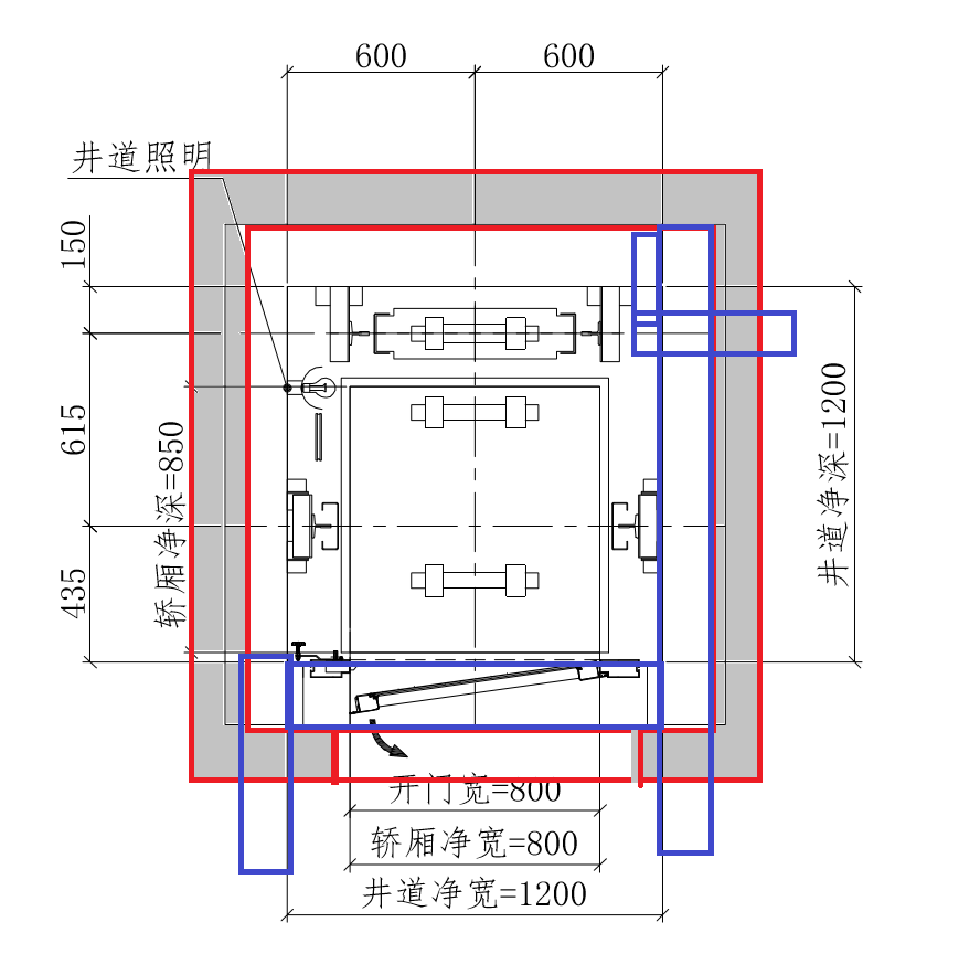 我非常想装,于是我找厂家要了平面图,研究之后我向厂家保证了可以通过修改管道位置确保能安装。厂家也就同意了。最终安装这个井道,设计了电梯。