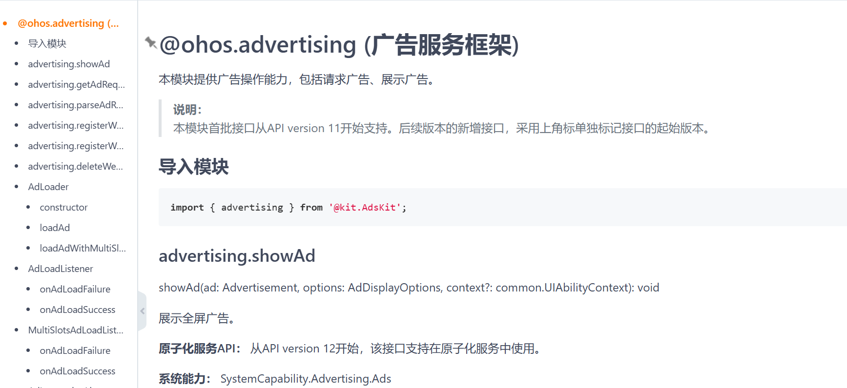 - 数据爬取:在华为开源的API手册中爬取文本、表格、代码等内容,如图,是官方手册中广告服务框架的api,将其中的文本、导入代码等爬取后进行整理,并与API名称进行关联。