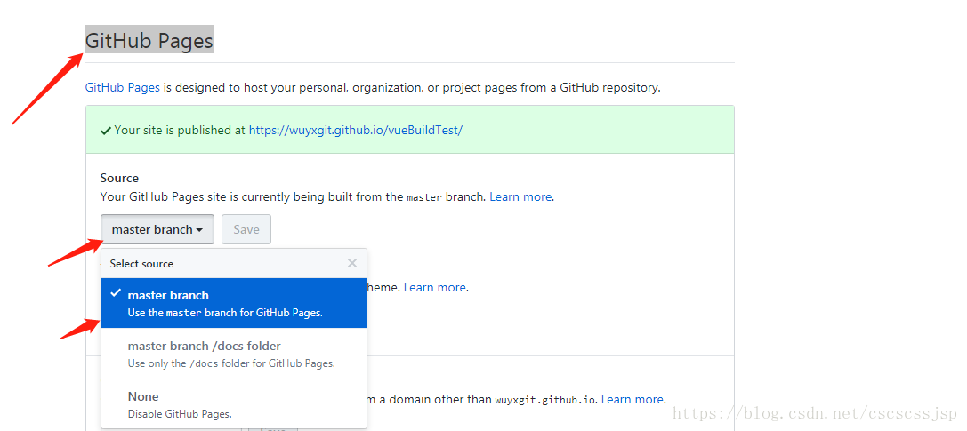 然后进入setting中,设置当前仓库的GitHub Pages,把它改为master branch