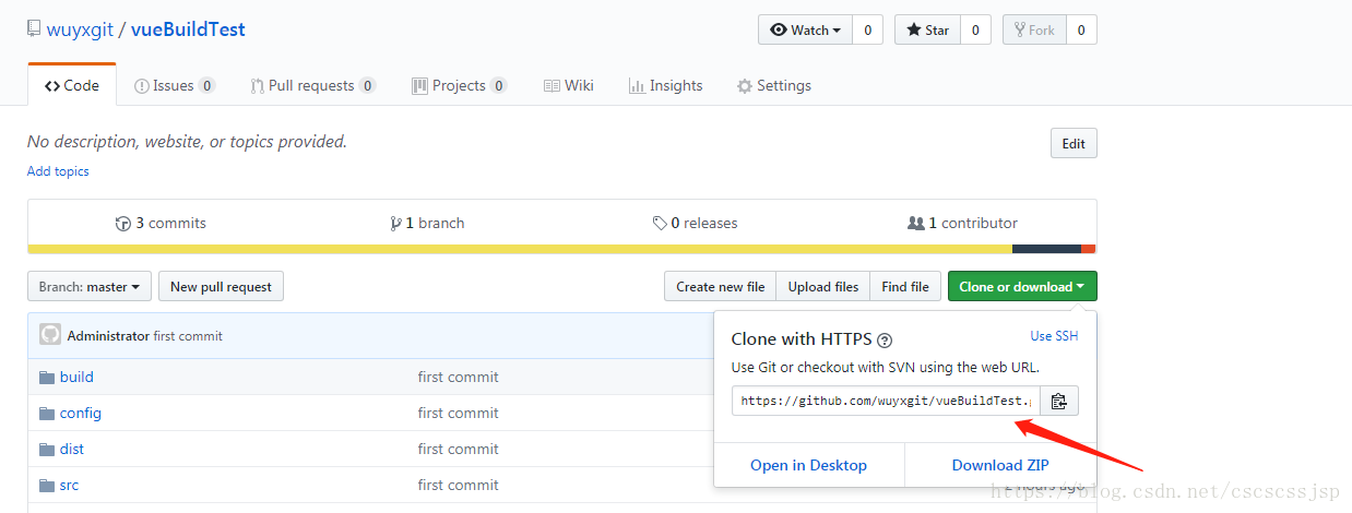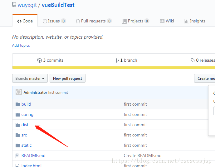 首先把vue项目打包,产生dist文件,把dist文件上传到GitHub仓库中,上传方法同上: