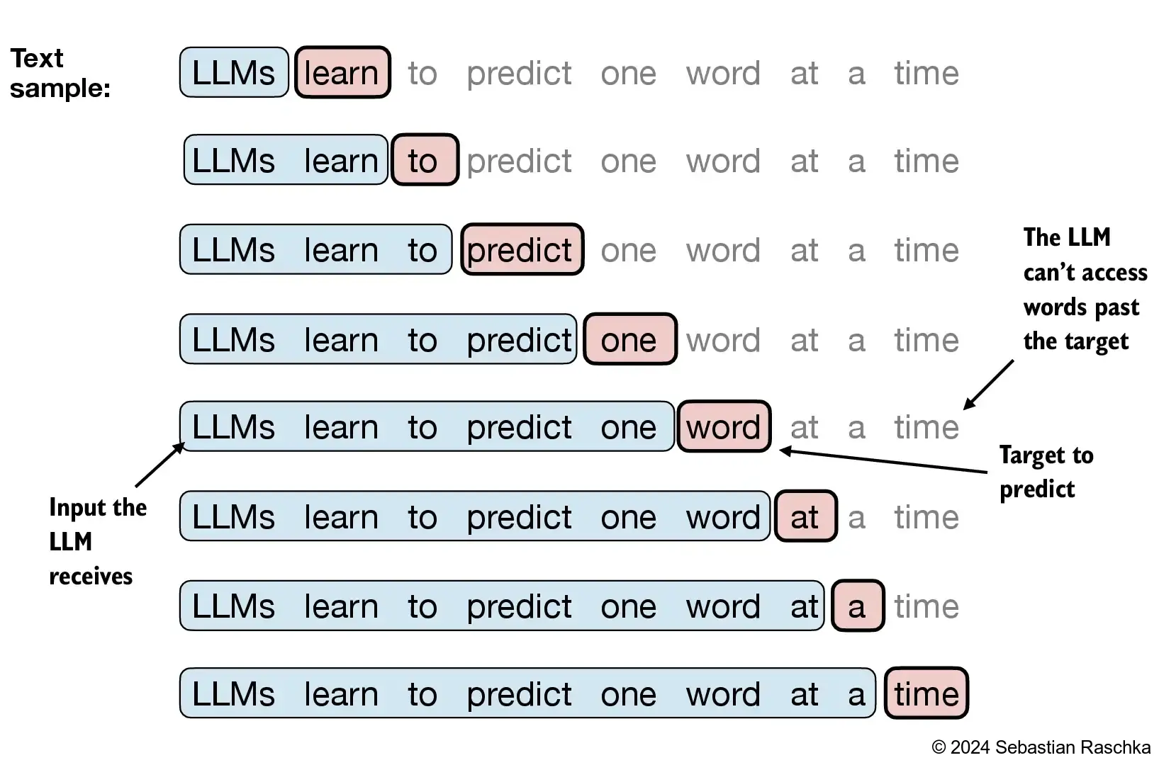 对于LLMs(大语言模型)而言,其输入和输出都来自同一语料,只是按照位置顺序进行了错位处理:将序列的前半部分作为输入,后半部分作为输出。整个数据处理流程如下图所示: