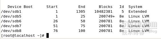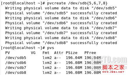 1.首先将硬盘sdb分4个区每个区大小200M,分别是sdb{5,6,7,8}。后将四个分区建立pv