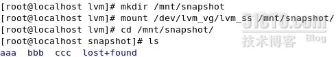 命令如下lvcreate -l 12 -s -n lvm_ss lvm_ss /dev/lvm_vg/lvm_lv 快照建立完成后我们将其挂载到/mnt/snapshot下