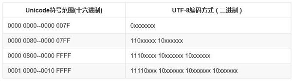 utf8规定:对于多字节的字符,第一个字节的前n位是1,第n+1位设为0,后面字节的前两位为10.剩余的二进制位全部用该字符的unicode码填充