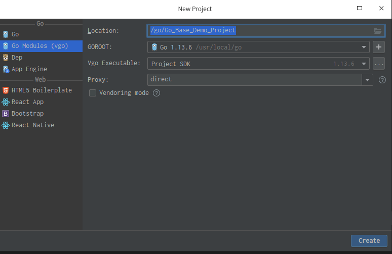 左侧第一个Go程序新建是基于GOPATH目录的,我们这里采用第二个Go Modules模块化创建,这样有利于我们后续多个项目独立化和引用版本控制。
