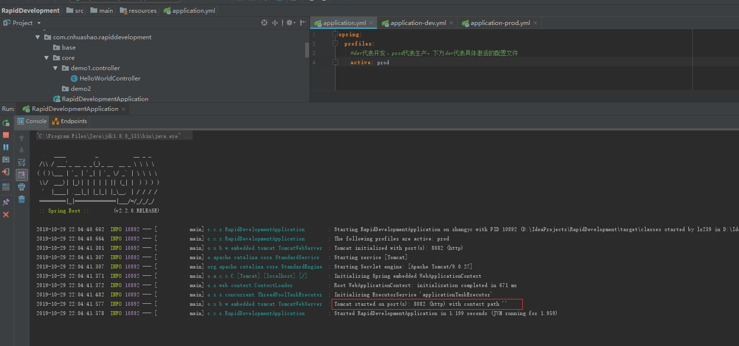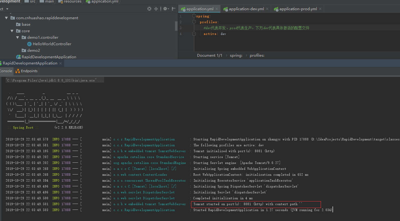 在SpringBoot中主要配置文件为application.properties配置文件,该文件我们也可以更改为application.yml,这里我们就直接采用application.yml的配置来实现生产、开发的配置分离。