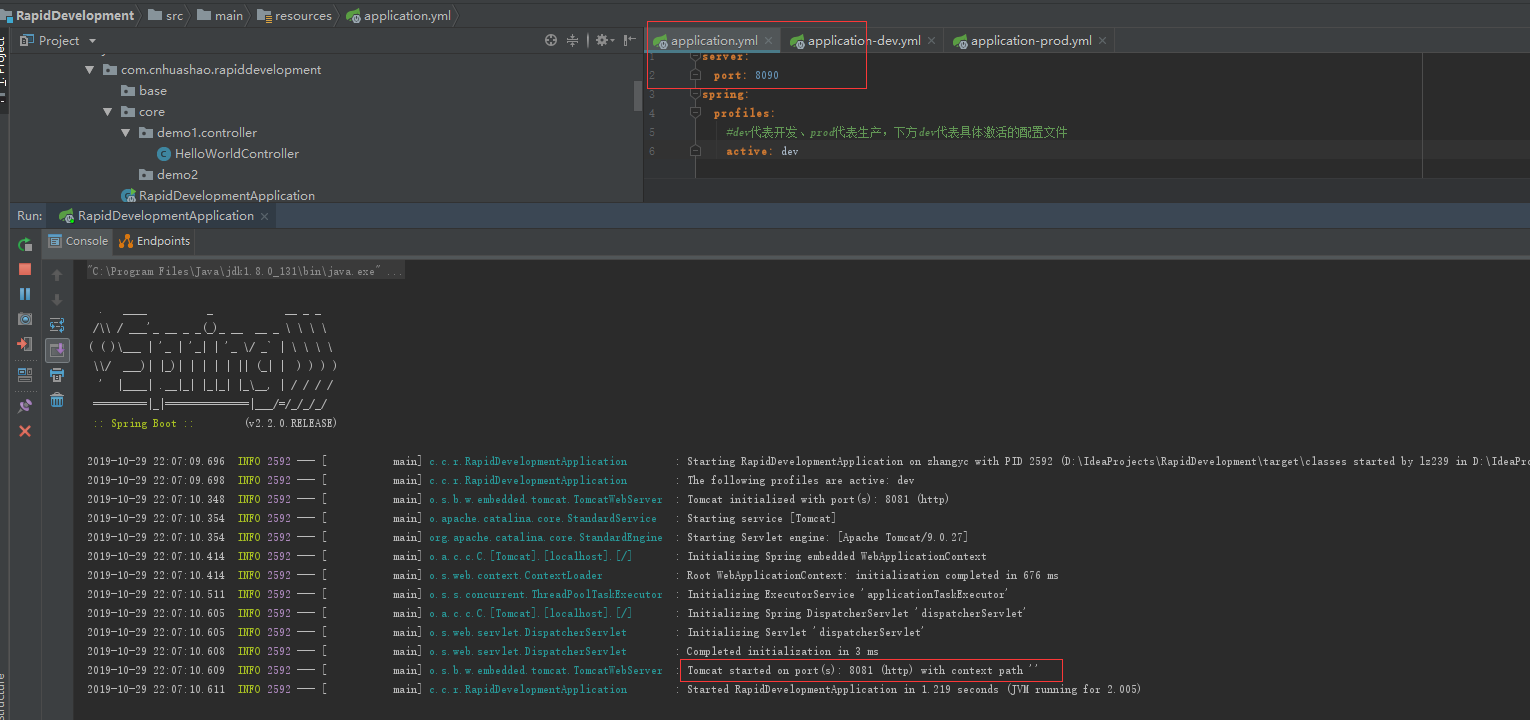 这里有个主意事项,如果application.yml中也存在port的配置时,与其激活的application-dev.yml哪个会优先呢?下面我们做个试验: