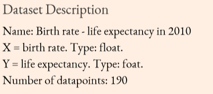 自变量X为出生率,数据类型为float,因变量Y为平均寿命,类型为float;数据集一共有190个数据点。