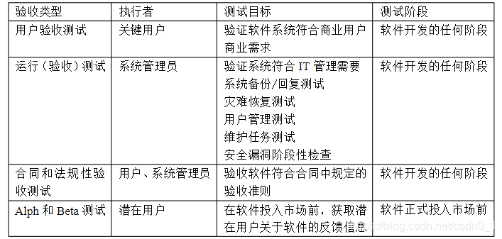 包括:合同验收测试、规范验收测试、Alpha和Beta测试、用户验收测试、运行(验收)测试