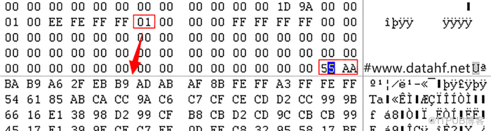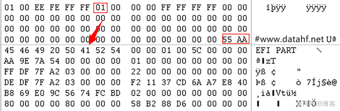 对服务器中所有硬盘底层数据观察发现0扇区均出现了“55 AA”(0x01C2H处表示该分区的类型,这里显示“05”,代表这是一个扩展分区。所以该MBR分区结构状态不正常)。除了8号硬盘是一个正常的MBR分区,其0x01C6处数值代表指向的下一个扇区为GPT的头部。